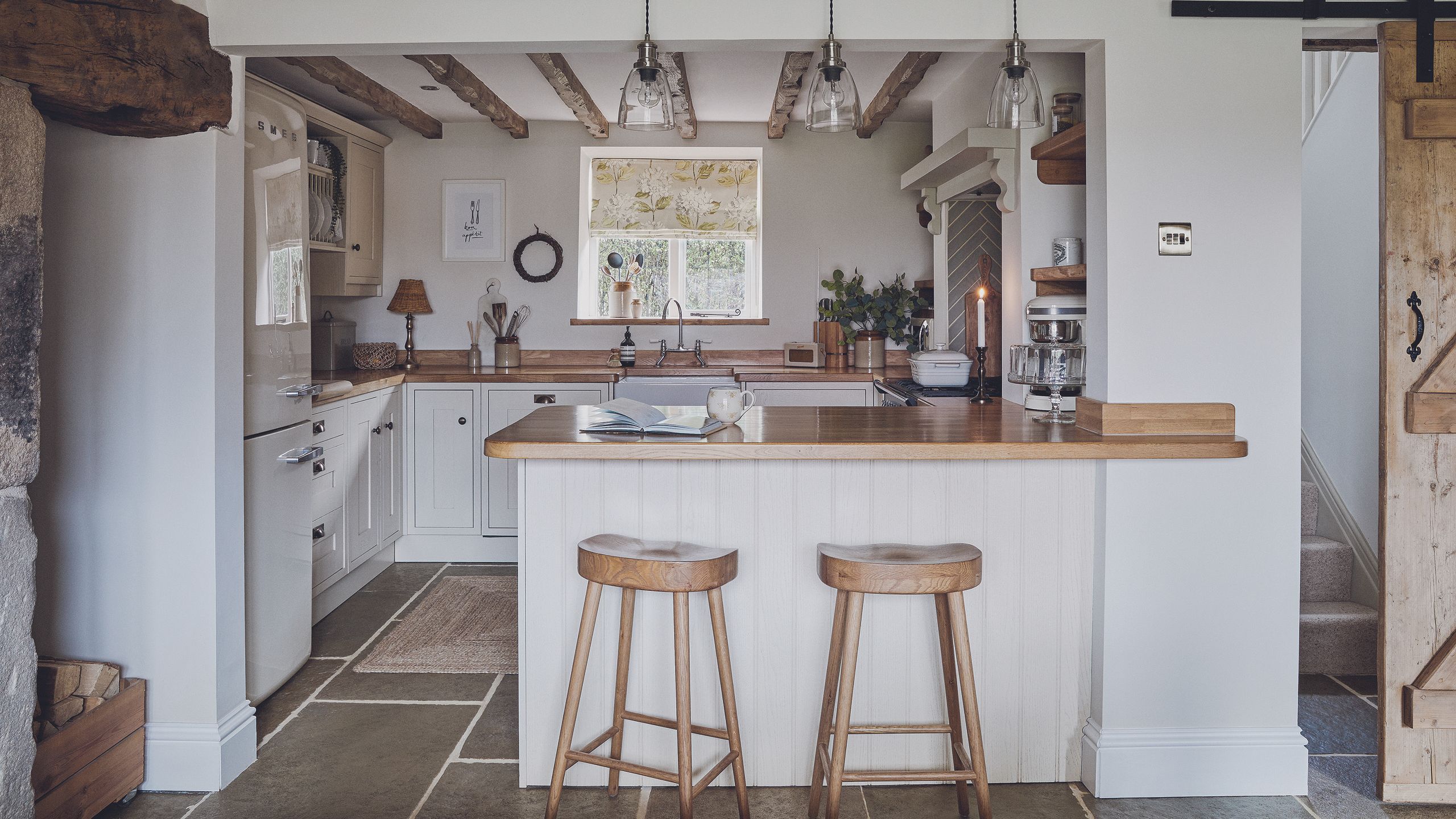 Slimline kitchen islands, like the style in this country kitchen, mean that you still reap the rewards of a typical island layout without losing too much floor space. To achieve this small kitchen island idea, you can opt for slimline freestanding styles or choose to have one made in the same style as your kitchen.
