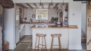 You can achieve a lot with just one wall to work with. Charli Howard’s kitchen features a one-wall design with Crittall-style doors on the opposite wall, allowing both adequate storage and ample light to enter.