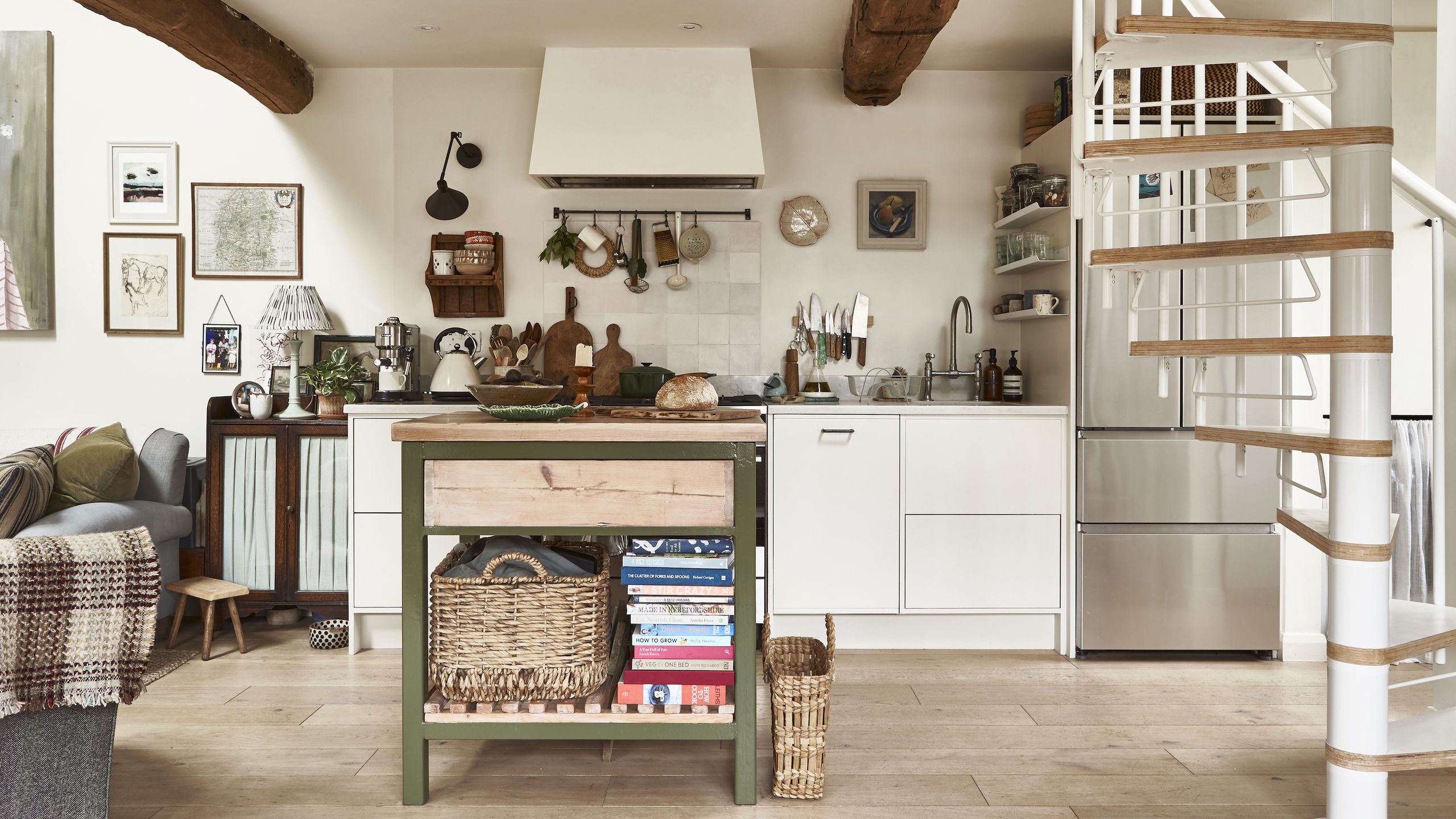 The kitchen island is painted green and lends a sharp pop of colour to the interior. Iona’s numerous recipe books are neatly tucked underneath alongside a handy storage basket.