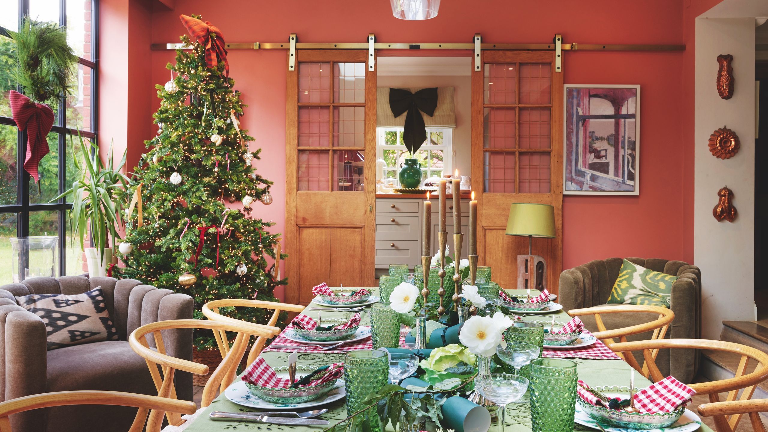 A large tree always takes pride of place in the living room window. Decorations and baubles in shades of gold, pink, red, silver and green create a magnificent display and the colours perfectly complement the room scheme.