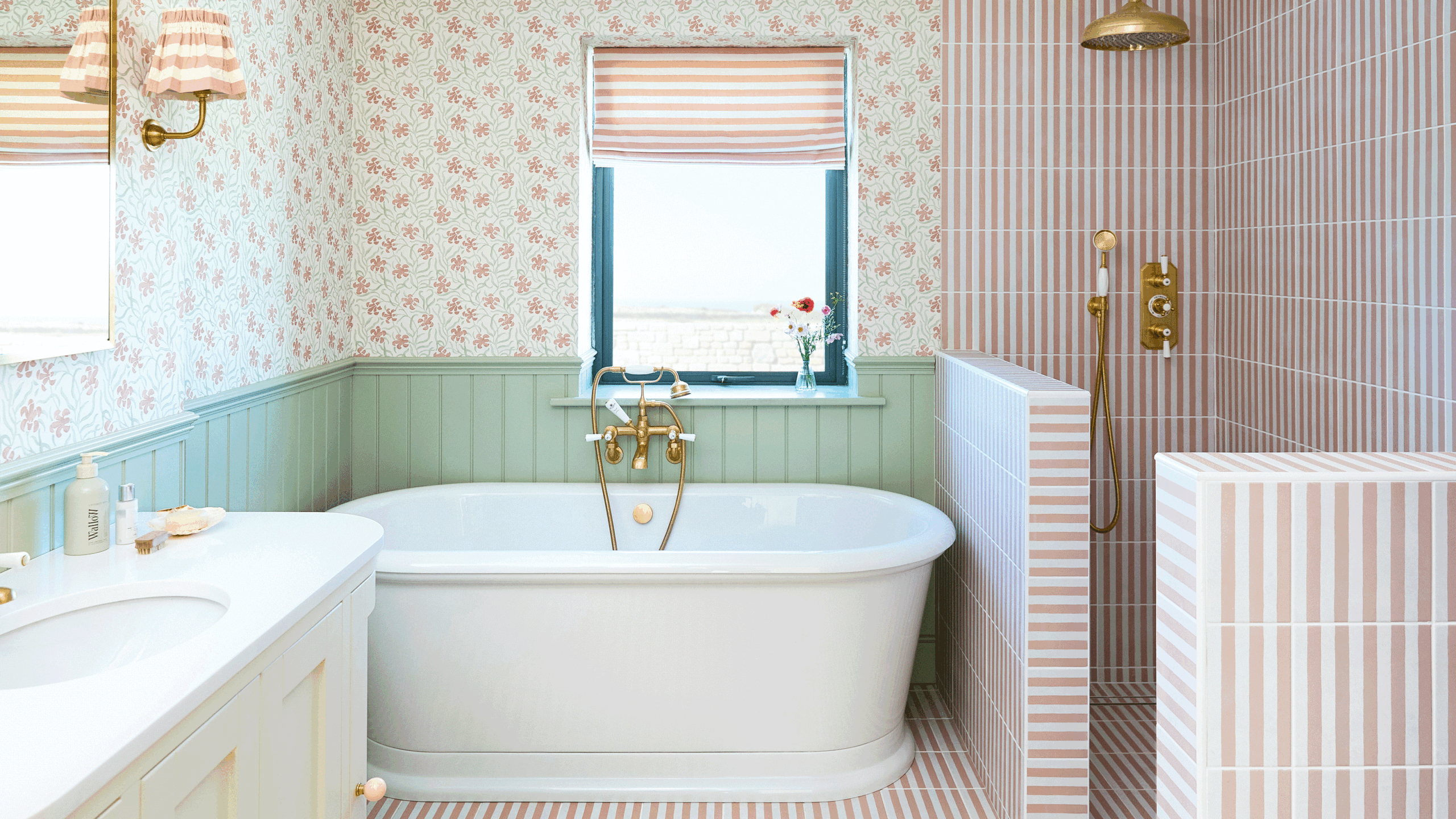 The main inspiration for the bathroom colour scheme came from an Alice Palmer wallpaper that Lorna loved. ‘I wanted something fun, and the colours worked so beautifully together,’ she says. ‘I had also long admired the stripy Ca’Pietra tiles and now had a chance to use them.’